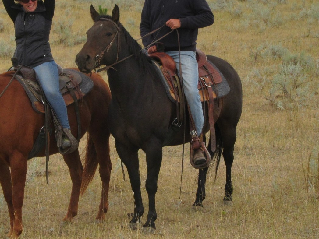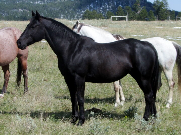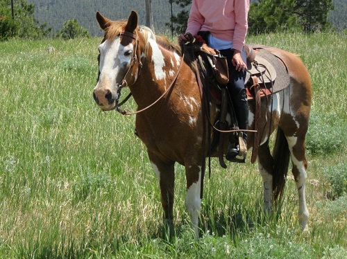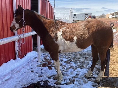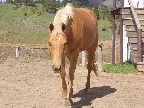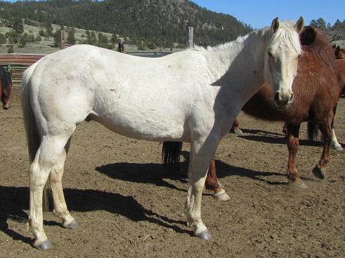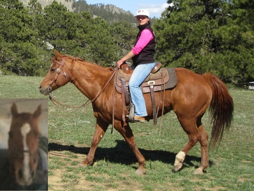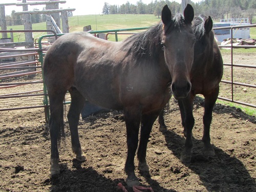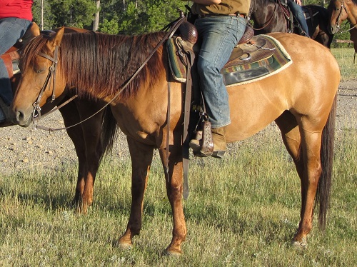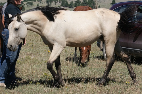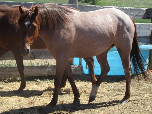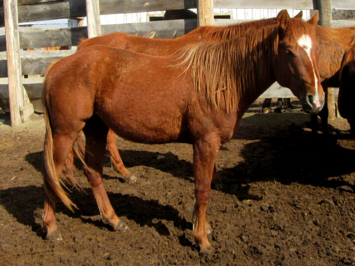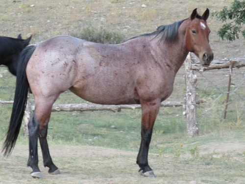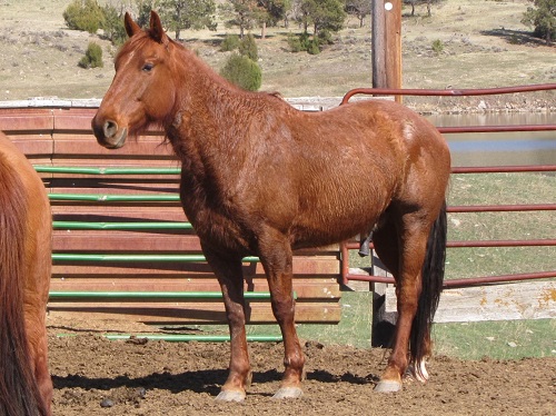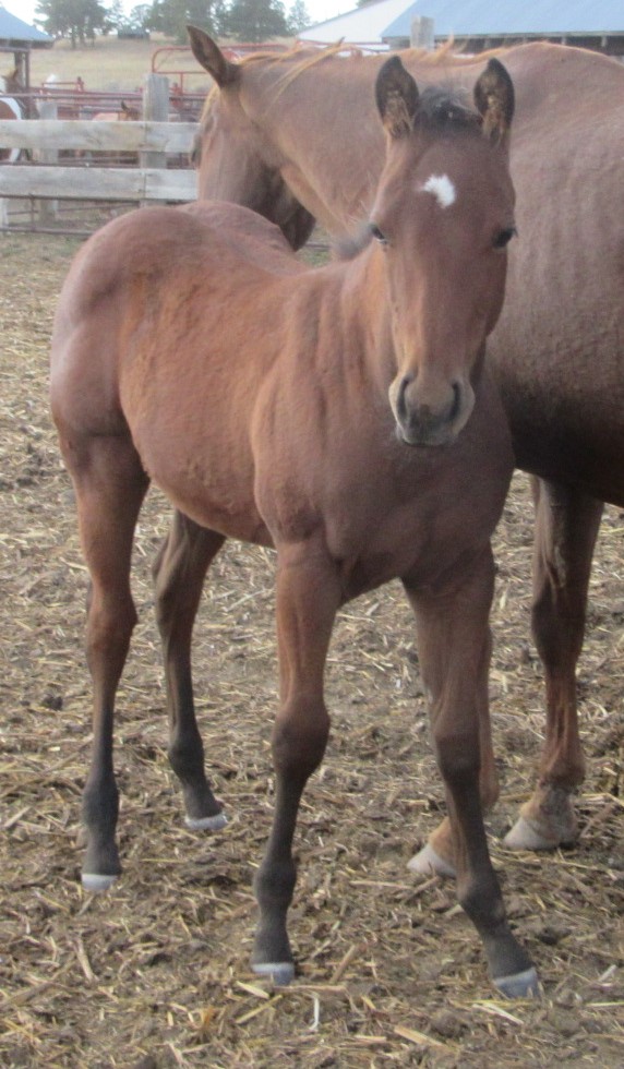 brown, hind pasterns white, upside down mushroom brand right shoulder |