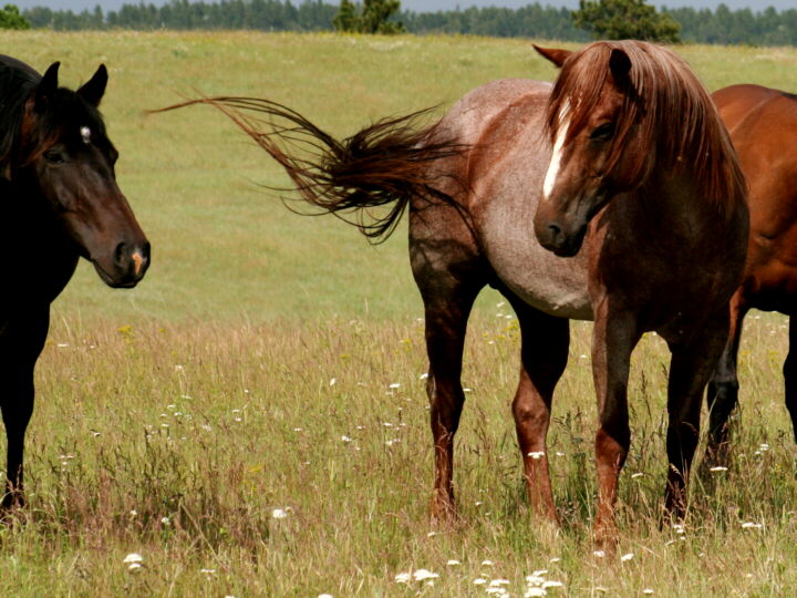 We drive the herd, including stallion, on horseback to new pastures.