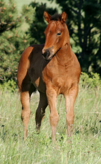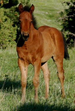 Zan Parrs X Mas (Dorky Frosty Spark x Watch for Friday) , 2011 chestnut filly, just a day old and at 4 month old - the Christmas tree on her forehead gave her the name